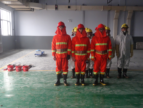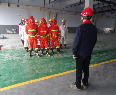 首先由安环部张经理对本次消防安全演练的方案、程序、灭火器材及其使用方法、各专业队伍的分工等相关细节进行逐一介绍,按照模拟的“场景”:“生产部工作人员正在卸料,搬运过程中,危险废液不慎流出,导致工作人员中毒倒地,以致引发火灾。”