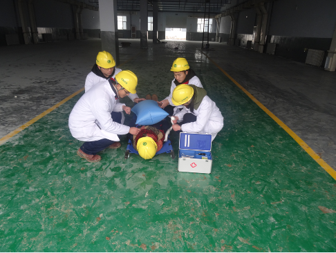 生产员工第一时间通知暂存库人员,暂存库人员以最快速度到公司应急装备室穿戴劳动防护用品,携带应急装备,开始对伤员进行初期抢救。